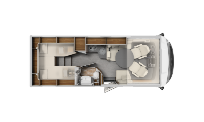- Shranjevalni prostori: dvojno dno, v katerem so nameščeni sistemi, je zaščiteno, izolirano in ogrevano. To je zasluga moči in široke pokritosti ogrevalnega sistema, ki ga upravlja sodobna programabilna digitalna plošča in je na voljo tudi na dizel, elektrika ali prefinjen konvekcijski sistem s toplotnimi izmenjevalniki med vožnjo. Od kabine do garaže, od dnevne sobe do kopalnice, vse je popolnoma ogrevano, tudi rezervoarji za vodo. Nahajajo se blizu zadnje osi za popolno ravnovesje obremenitve, delno so vstavljeni v dvojno dno in delno v ogrevano snemljivo lupino, izolirano s poliuretanom.