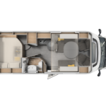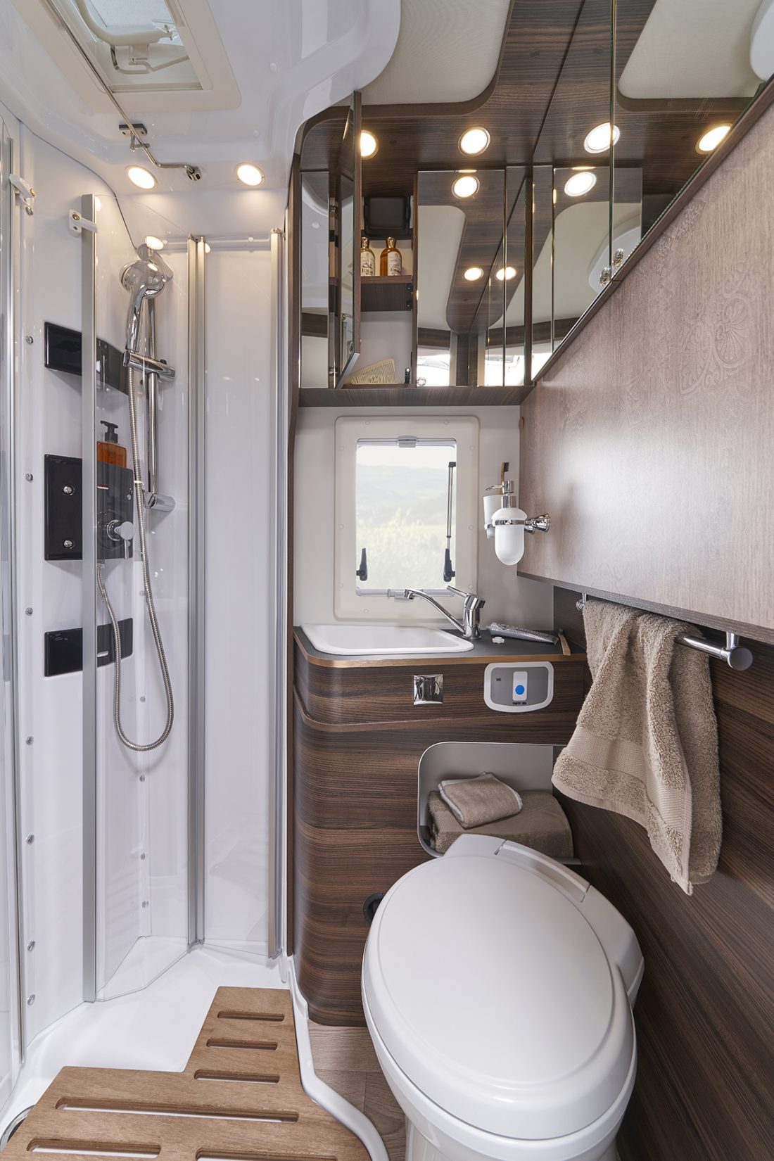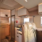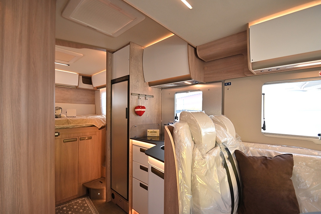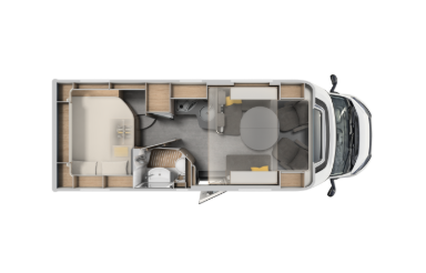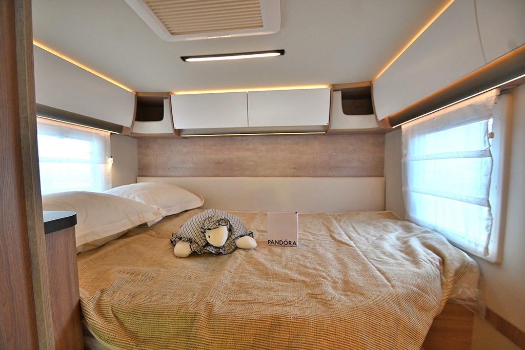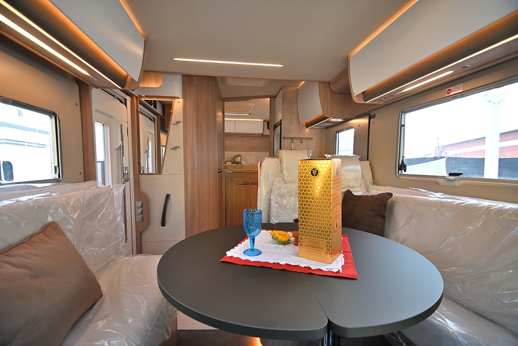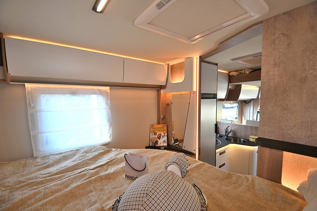- Shranjevalni prostori: dvojno dno, v katerem so nameščeni sistemi, je zaščiteno, izolirano in ogrevano. To je zasluga moči in široke pokritosti ogrevalnega sistema, ki ga upravlja sodobna programabilna digitalna plošča in je na voljo tudi na dizel, elektrika ali prefinjen konvekcijski sistem s toplotnimi izmenjevalniki med vožnjo. Od kabine do garaže, od dnevne sobe do kopalnice, vse je popolnoma ogrevano, tudi rezervoarji za vodo. Nahajajo se blizu zadnje osi za popolno ravnovesje obremenitve, delno so vstavljeni v dvojno dno in delno v ogrevano snemljivo lupino, izolirano s poliuretanom.