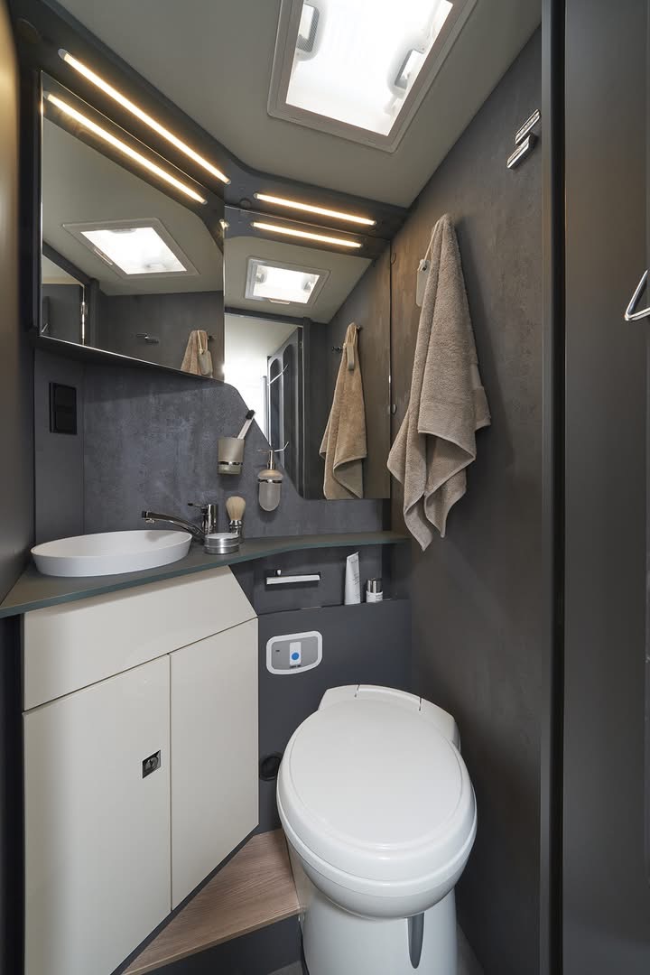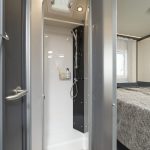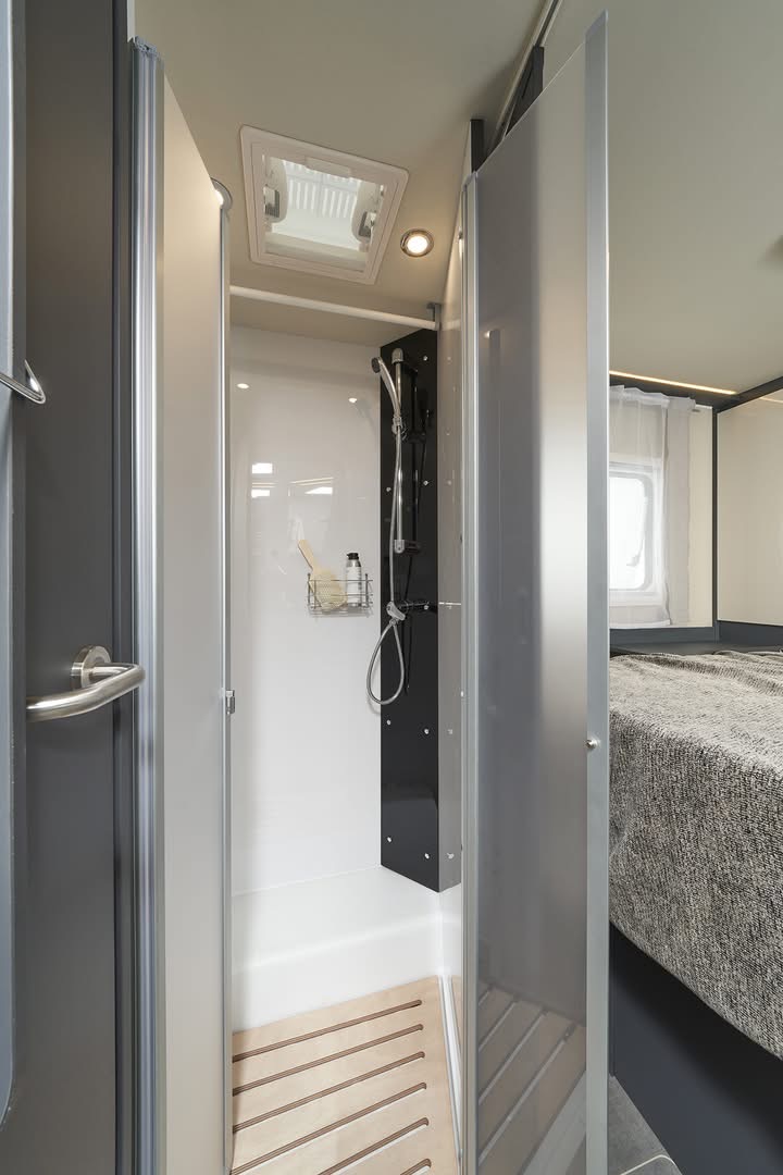 - Udobna ločena prha: ekstra velika,tudi v različici Vario, namensko strešno okno in osvetlitev, lesena terasa in stolp z armaturami