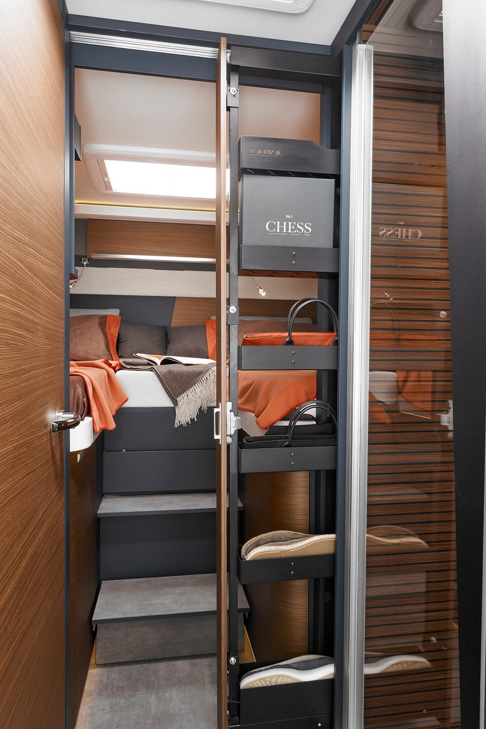 - Navpična izvlečna omara, dve izvlečni omari pod enojnima posteljama. Možno je tudi dodati ali odstraniti police, držala in stojala za čevlje