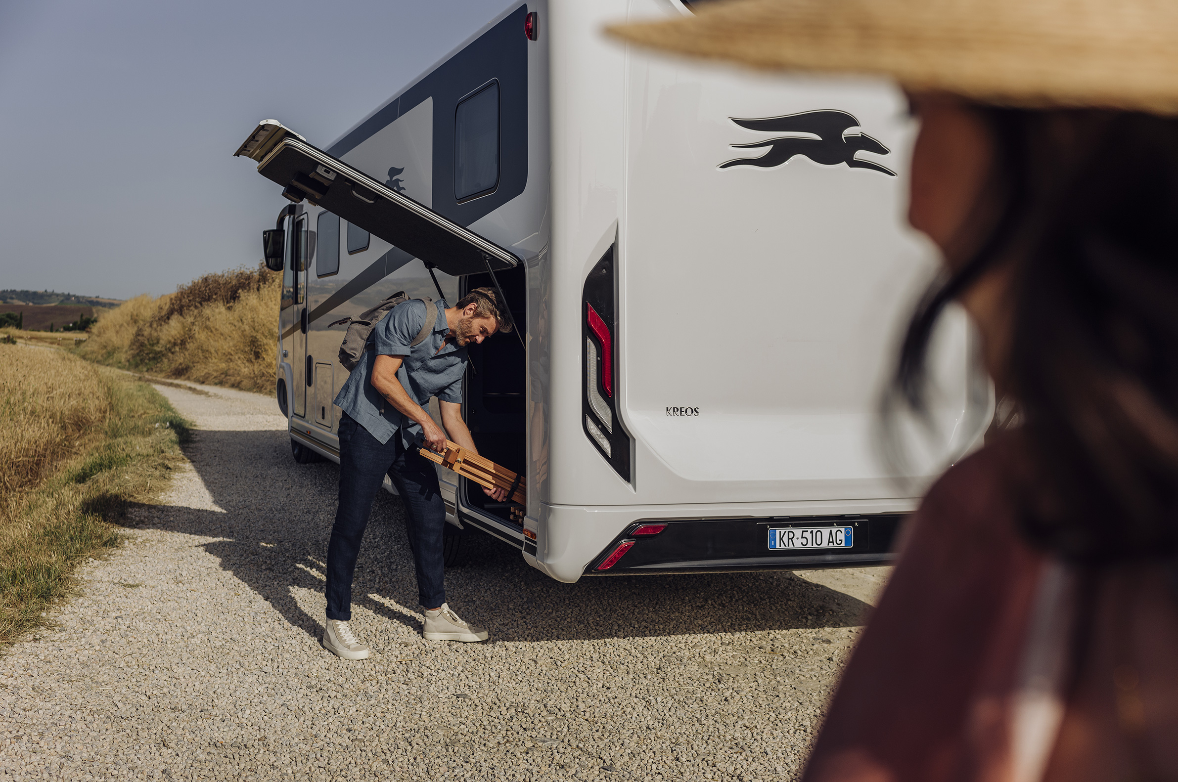 Za vso vašo opremo je na voljo izjemno prostoren prtljažni prostor, nameščen pod veliko posteljo v zadnjem delu vozila. Dostopen je iz notranjosti avtodoma ter z leve in desne zunanje strani, kar omogoča enostavno in hitro shranjevanje prtljage, športne opreme ali dodatkov za kampiranje.
