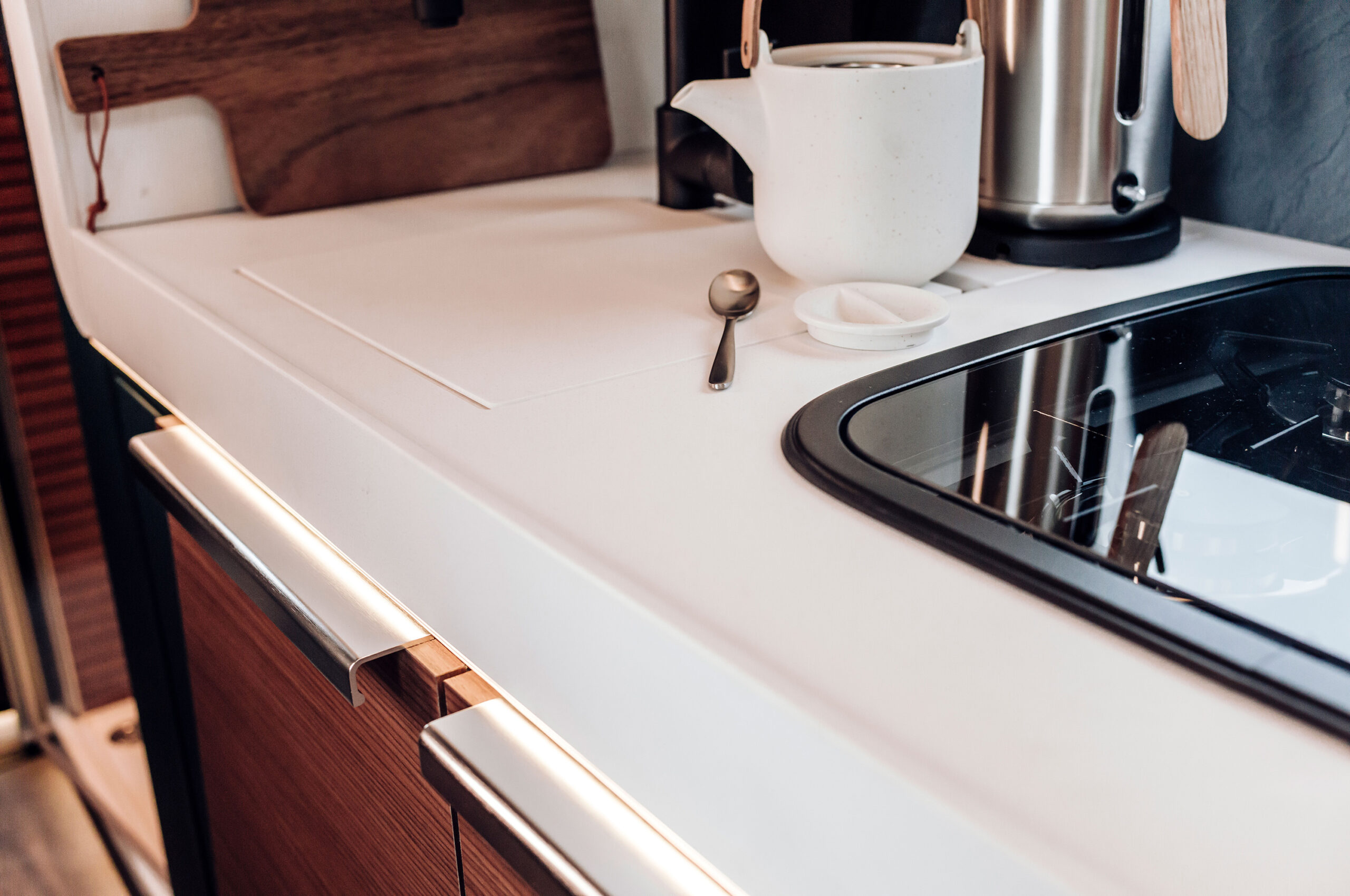 - Dva pomivalna korita, velika delovna plošča, kuhalna plošča naslednje generacije, strešno okno z električnim ventilatorjem, držalo za začimbe, držalo za steklenice